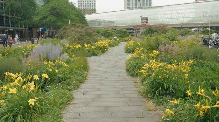 Another example of a sponge city is found near Amsterdam Sloterdijk Station. There too, water crates under the ground store rainwater. During dry periods, the water is used for the plants. So rainwater doesn’t flow straight into the sewers, but stays useful in the city.